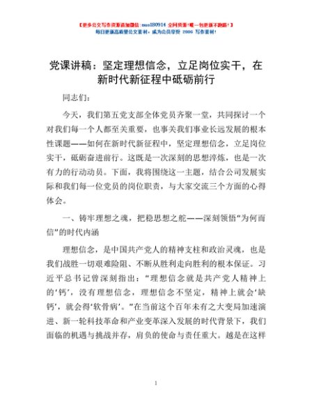 / 党课讲稿:坚定理想信念,立足岗位实干,在新时代新征程中砥砺前行