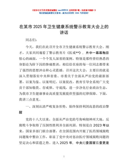 / 在某市2025年卫生健康系统警示教育大会上的讲话