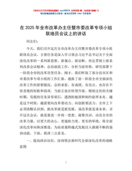 / 在2025年全市改革办主任暨市委改革专项小组联络员会议上的讲话