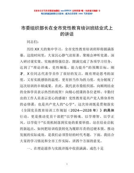 / 市委组织部长在全市党性教育培训班结业式上的讲话