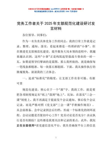 / 党务工作者关于2025年支部规范化建设研讨发言材料