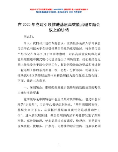 / 在2025年党建引领推进基层高效能治理专题会议上的讲话