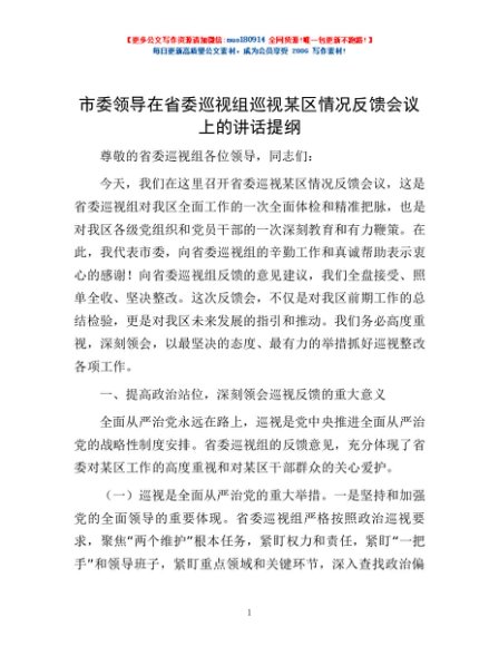 / 市委领导在省委巡视组巡视某区情况反馈会议上的讲话提纲