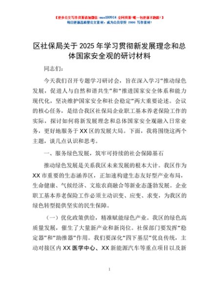 / 区社保局关于2025年学习贯彻新发展理念和总体国家安全观的研讨材料