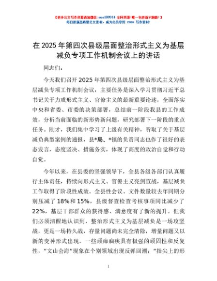 / 在2025年第四次县级层面整治形式主义为基层减负专项工作机制会议上的讲话