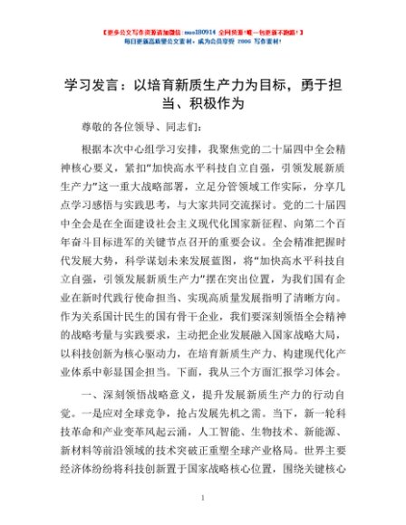 / 学习发言:以培育新质生产力为目标,勇于担当、积极作为