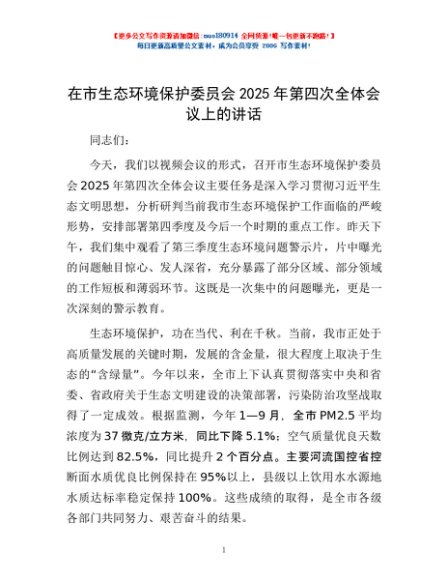 / 在市生态环境保护委员会2025年第四次全体会议上的讲话