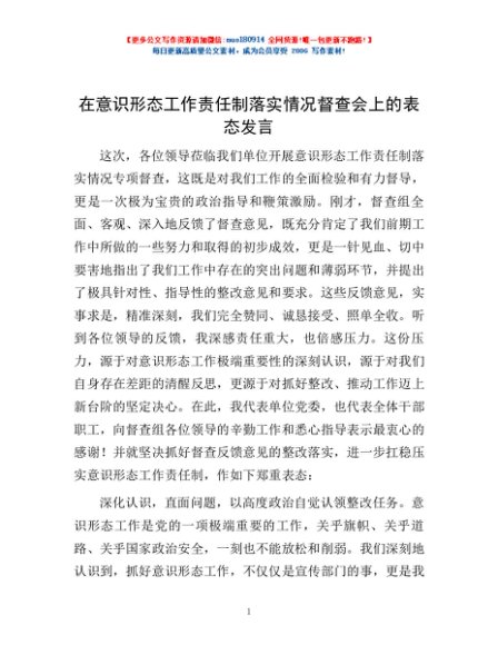 / 在意识形态工作责任制落实情况督查会上的表态发言