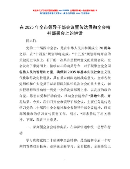 / 在2025年全市领导干部会议暨传达贯彻全会精神部署会上的讲话