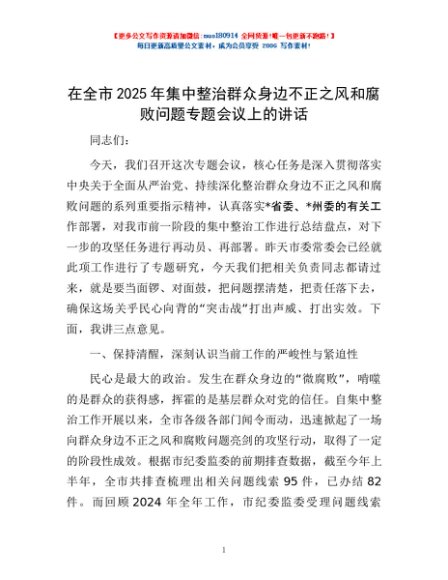 / 在全市2025年集中整治群众身边不正之风和腐败问题专题会议上的讲话