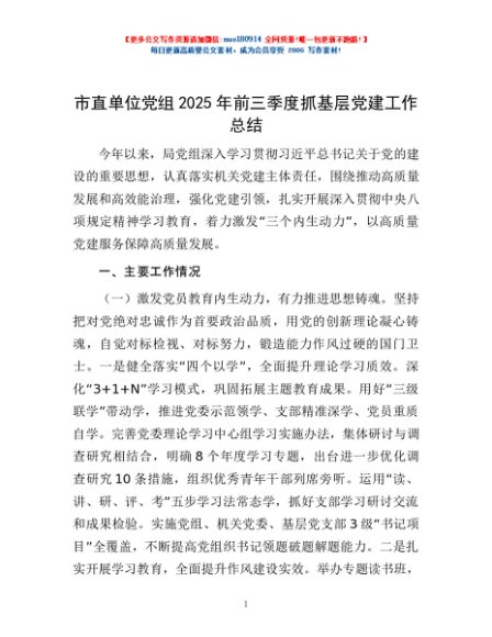 / 市直单位党组2025年前三季度抓基层党建工作总结
