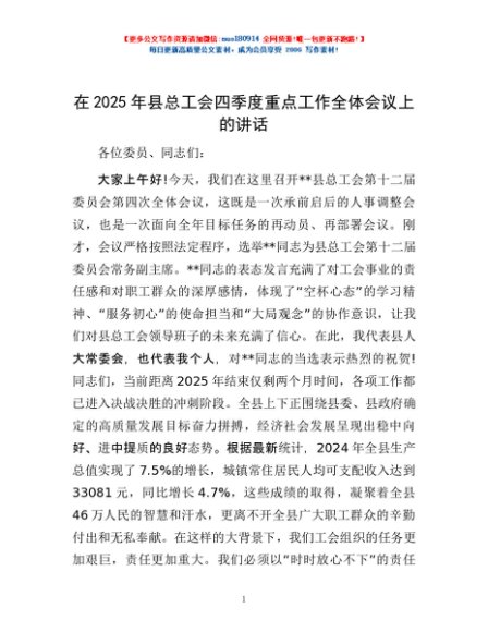 / 在2025年县总工会四季度重点工作全体会议上的讲话