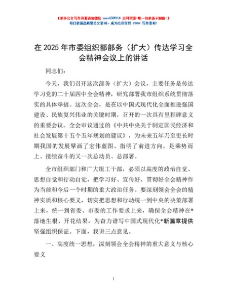 / 在2025年市委组织部部务(扩大)传达学习全会精神会议上的讲话