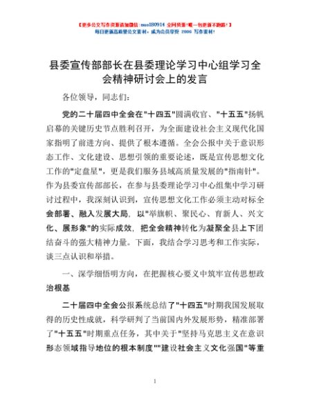/ 县委宣传部部长在县委理论学习中心组学习全会精神研讨会上的发言