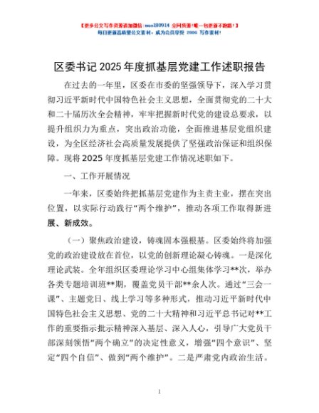 / 区委书记2025年度抓基层党建工作述职报告