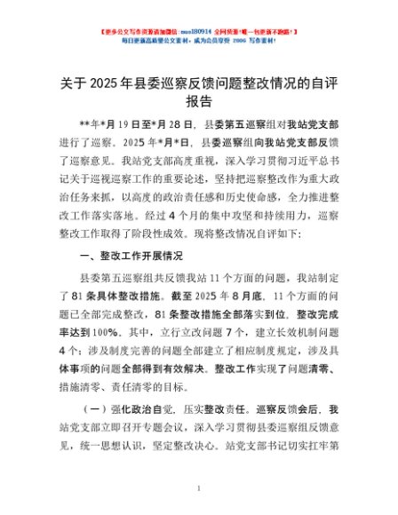 / 关于2025年县委巡察反馈问题整改情况的自评报告