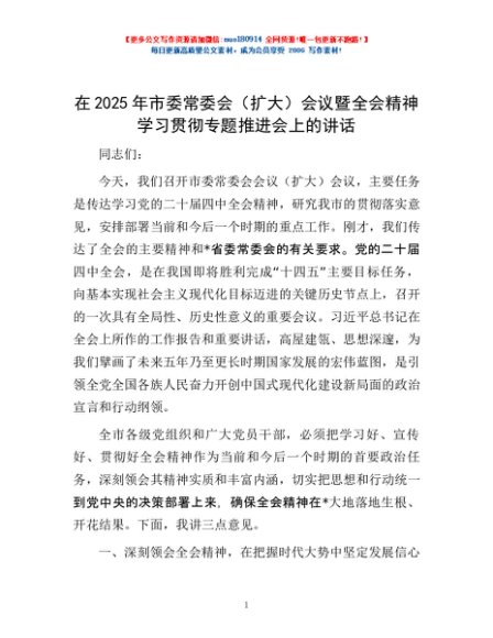 / 在2025年市委常委会(扩大)会议暨全会精神学习贯彻专题推进会上的讲话