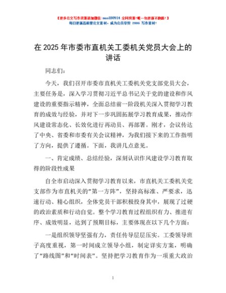 / 在2025年市委市直机关工委机关党员大会上的讲话