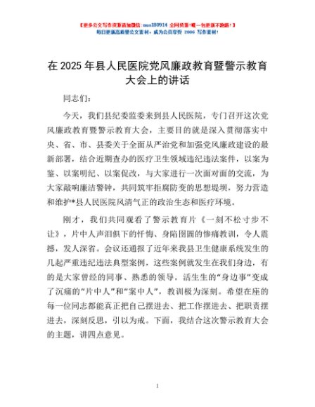 / 在2025年县人民医院党风廉政教育暨警示教育大会上的讲话