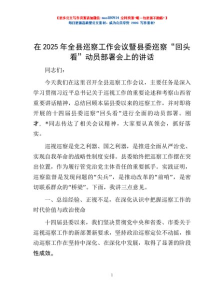 / 在2025年全县巡察工作会议暨县委巡察“回头看”动员部署会上的讲话