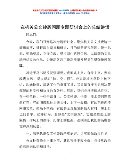 / 在机关公文抄袭问题专题研讨会上的总结讲话