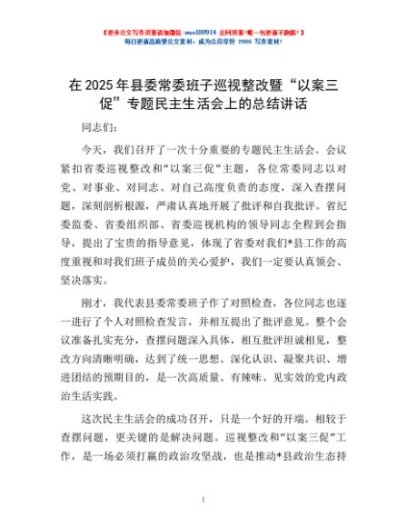 / 在2025年县委常委班子巡视整改暨“以案三促”专题民主生活会上的总结讲话