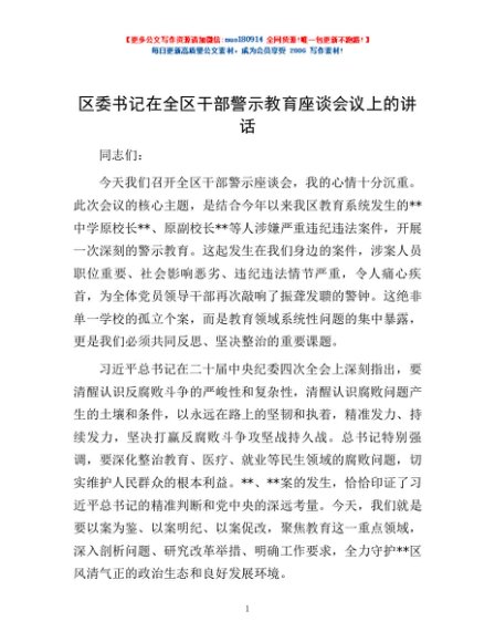 / 区委书记在全区干部警示教育座谈会议上的讲话
