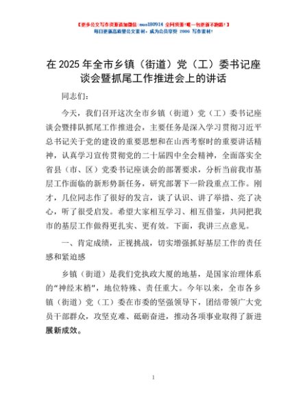 / 在2025年全市乡镇(街道)党(工)委书记座谈会暨抓尾工作推进会上的讲话