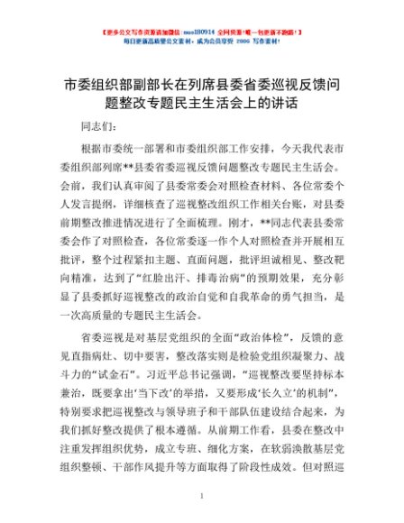 / 市委组织部副部长在列席县委省委巡视反馈问题整改专题民主生活会上的讲话