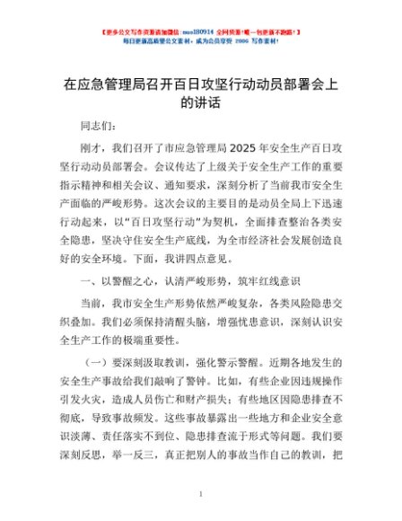 / 在应急管理局召开百日攻坚行动动员部署会上的讲话
