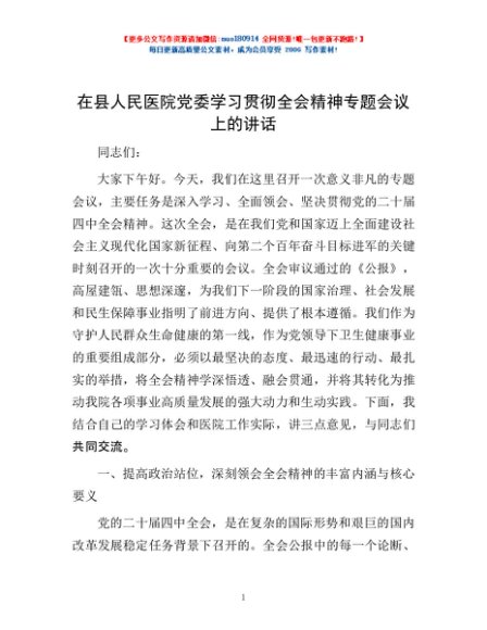 / 在县人民医院党委学习贯彻全会精神专题会议上的讲话