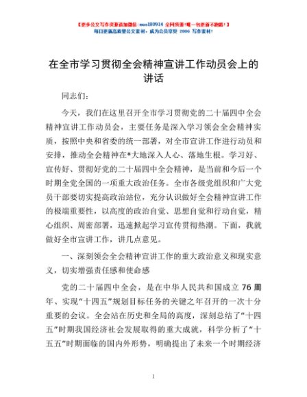 / 在全市学习贯彻全会精神宣讲工作动员会上的讲话