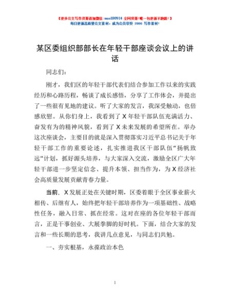 / 某区委组织部部长在年轻干部座谈会议上的讲话