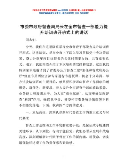 / 市委市政府督查局局长在全市督查干部能力提升培训班开班式上的讲话