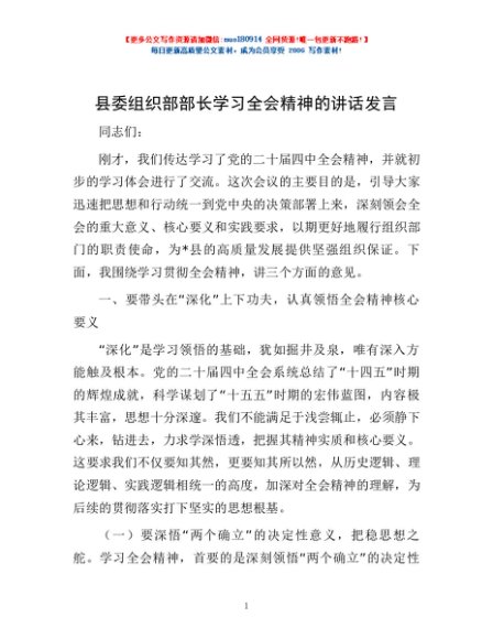 / 县委组织部部长学习全会精神的讲话发言