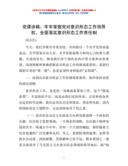 / 党课讲稿:牢牢掌握党对意识形态工作领导权,全面落实意识形态工作责任制