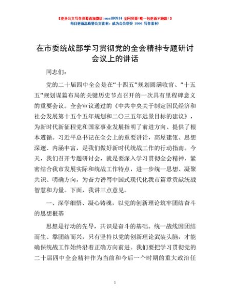 / 在市委统战部学习贯彻党的全会精神专题研讨会议上的讲话