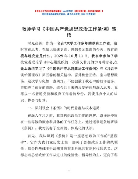 / 教师学习《中国共产党思想政治工作条例》感悟