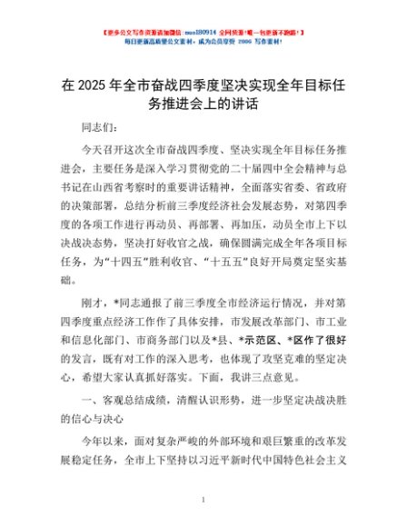 / 在2025年全市奋战四季度坚决实现全年目标任务推进会上的讲话