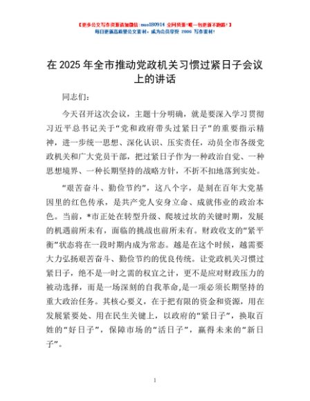 / 在2025年全市推动党政机关习惯过紧日子会议上的讲话