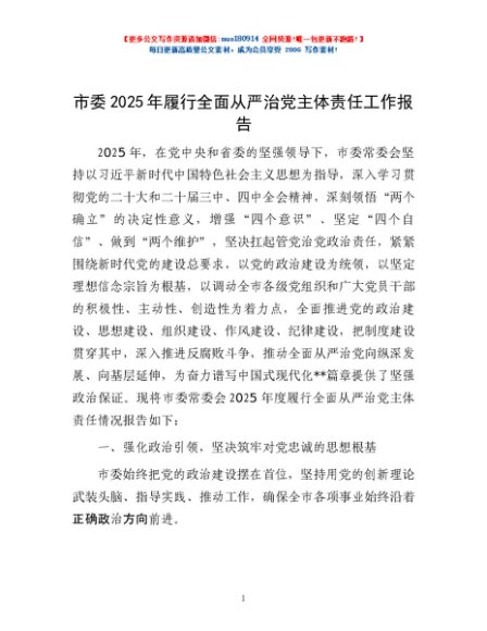 / 市委2025年履行全面从严治党主体责任工作报告