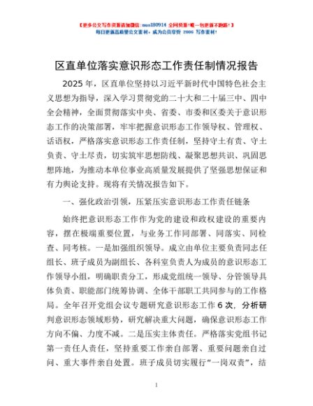 / 区直单位落实意识形态工作责任制情况报告