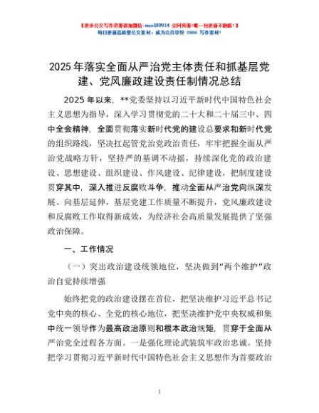 / 2025年落实全面从严治党主体责任和抓基层党建、党风廉政建设责任制情况总结