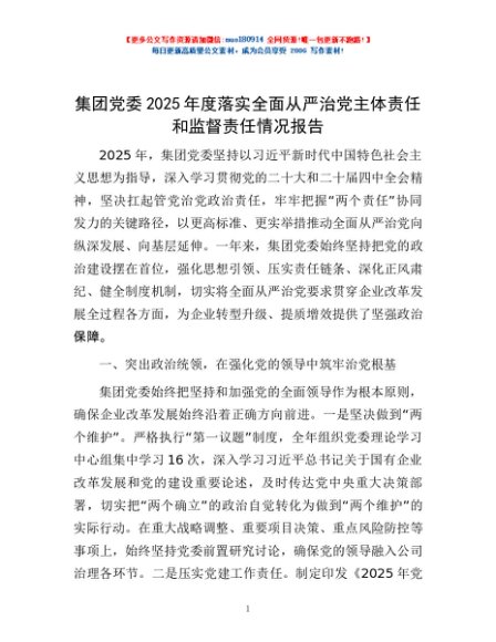 / 集团党委2025年度落实全面从严治党主体责任和监督责任情况报告
