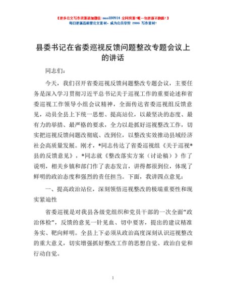 / 县委书记在省委巡视反馈问题整改专题会议上的讲话