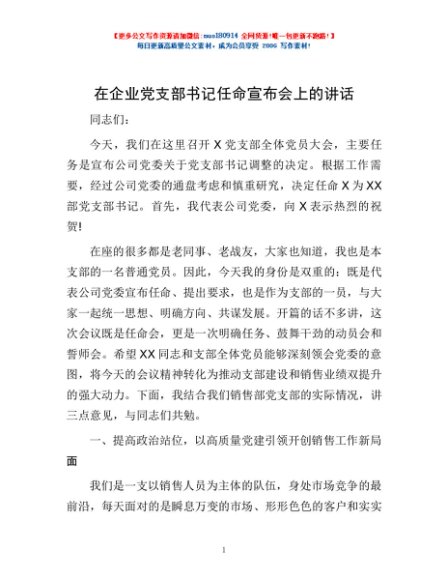 / 在企业党支部书记任命宣布会上的讲话