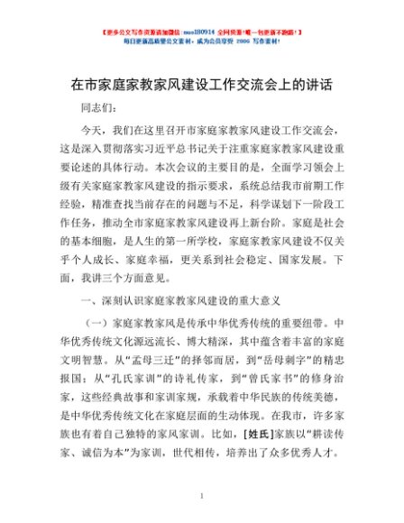 / 在市家庭家教家风建设工作交流会上的讲话