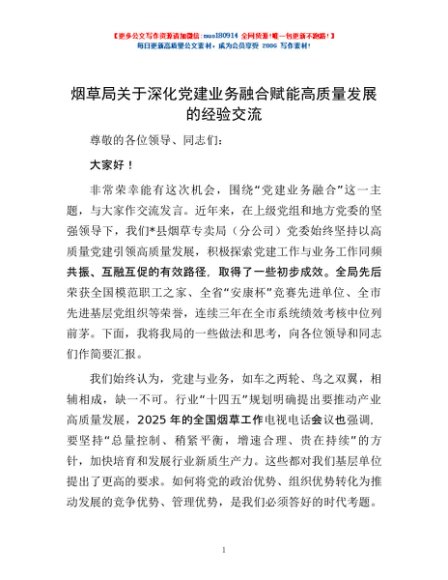 / 烟草局关于深化党建业务融合赋能高质量发展的经验交流