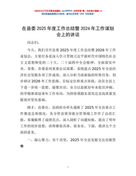 / 在县委2025年度工作总结暨2026年工作谋划会上的讲话