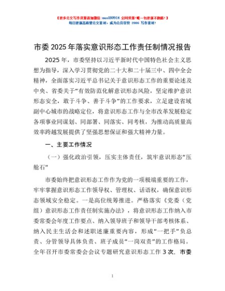 / 市委2025年落实意识形态工作责任制情况报告